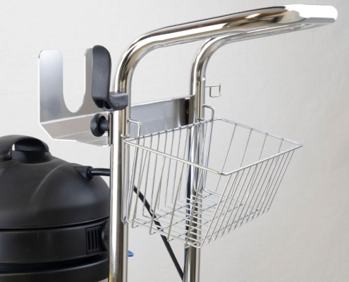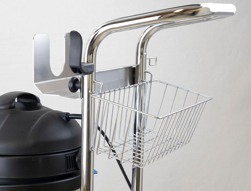 - Utrustad med slanghållare, hållare för förlängningsrör, dubbla tillbehörskorgar, kabelhållare, fäste för Steam Mop samt framhjul med 360° svängfunktion.