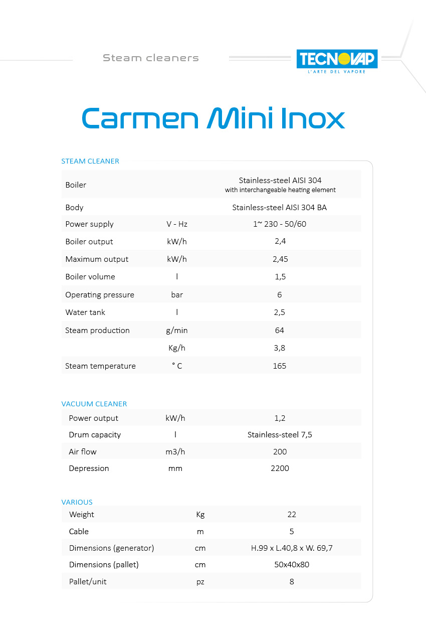 Carmen Mini Inox är en kraftfull 6-bars ångtvätt med ett ångkärl i rostfritt stål, utvecklad för semiprofessionell användning och förmågan att leverera torr, mättad ånga på upp till 165 °C.